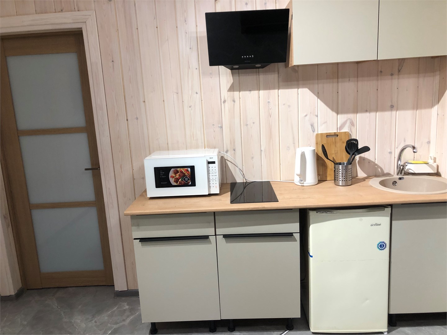 - Оборудование: микроволновая печь, мини-холодильник, набор посуды, плита электрическая, телевизор, электрочайник